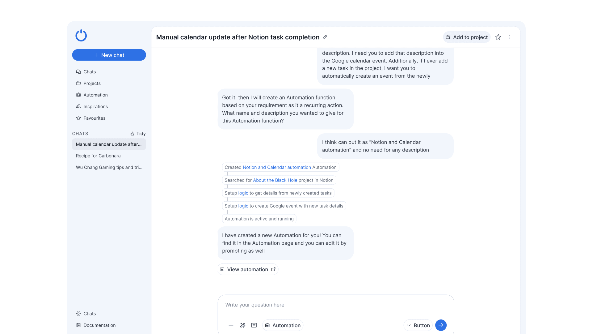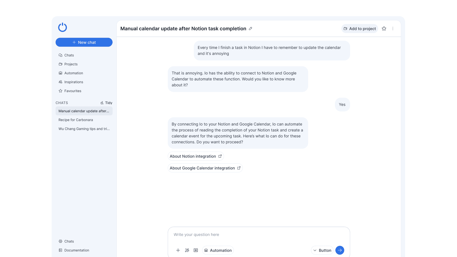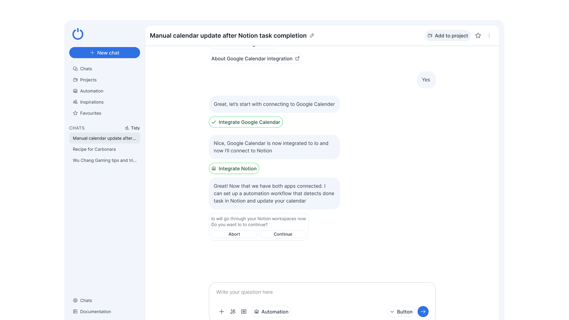 In this example, the user wanted to continue to enhance the automation that was just created into something that would repeat itself. The difference now was that Io would be creating an item called “Notion and Calendar automation” which could be found in Automation listing page later.
