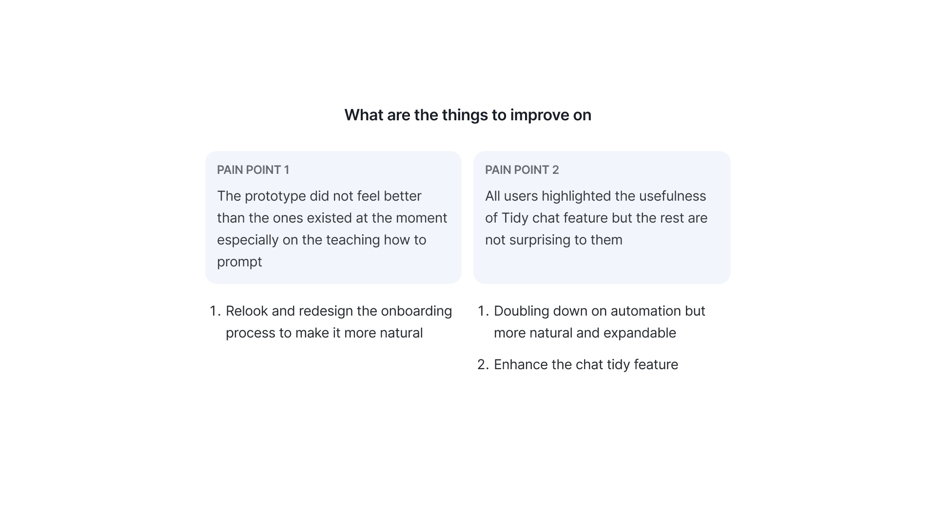 Generally all users think it is usable but lacks uniqueness compared to other AI assistants on the market in terms of look and feel. All users highlighted the usefulness of Tidy chat feature but the rest are not surprising to them