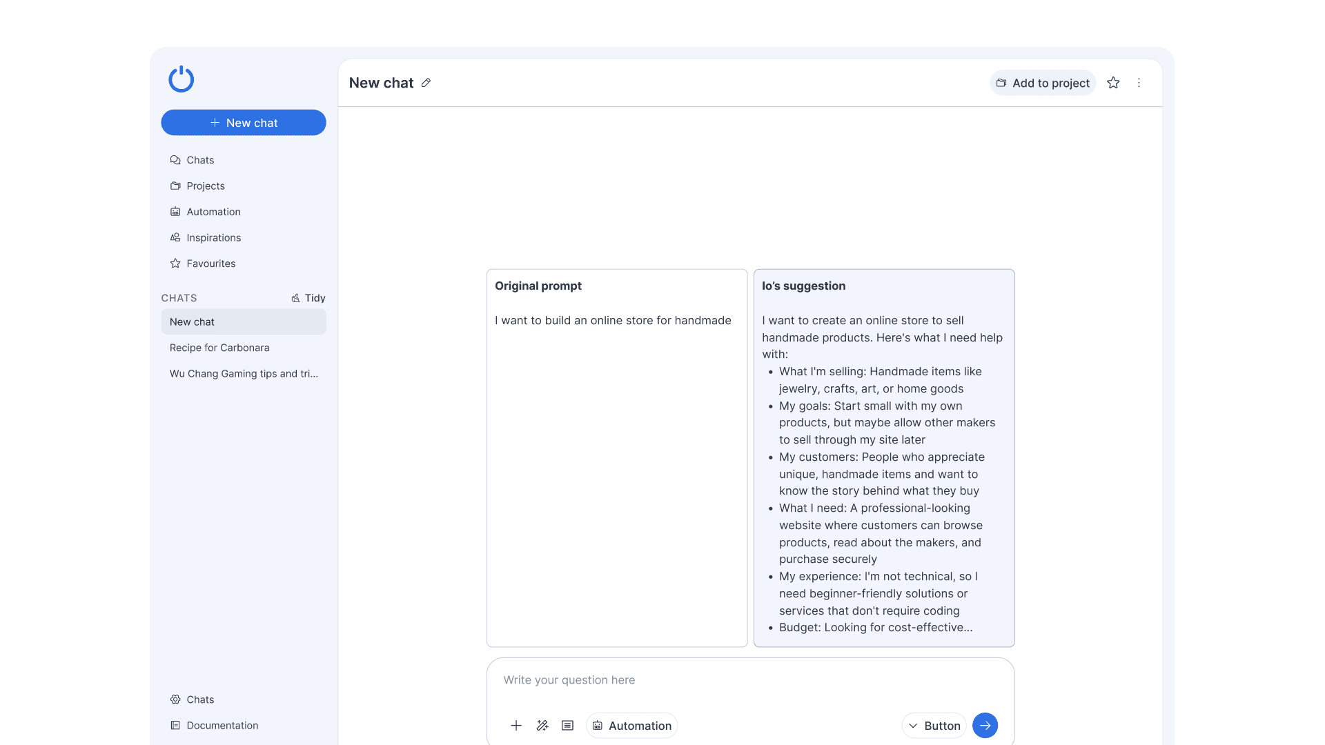 When the user selects an pre-suggested ideas the prompt is pre-written for the user but leaves out the details for the user to replace it with their own ideas.