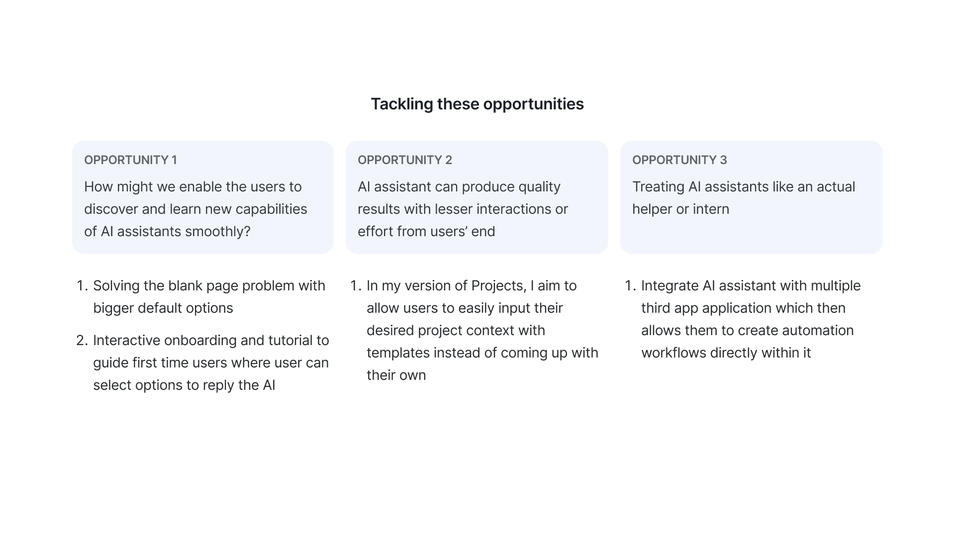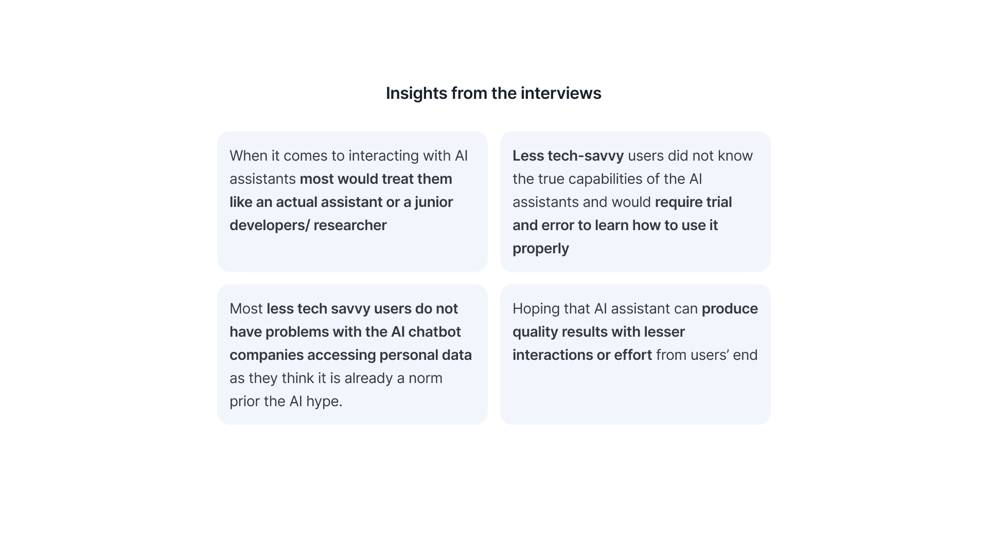 There were a few problems revealed in both the interviews and surveys but mostly align with my initial assumptions. I chose three problems that aligns with mine and also possible to solve through design. Some problems mentioned in the research would be eventually resolved when the AI model is improved (which it did in late 2025).