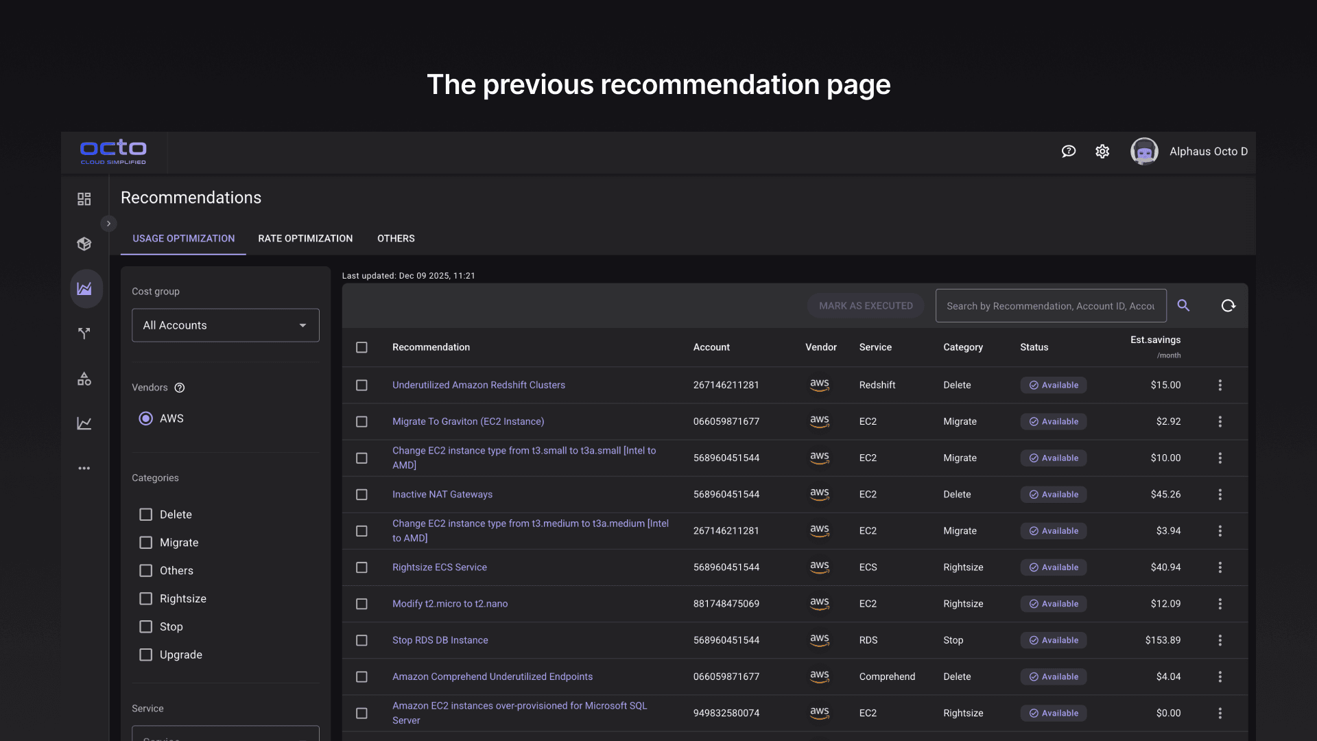Octo’s optimization recommendations identify cloud resources that can be resized, deleted, or optimized to reduce cost. Enterprise accounts generate hundreds and even thousands of recommendations, overwhelming teams and making selection and filtering optimization strategies difficult and time consuming.