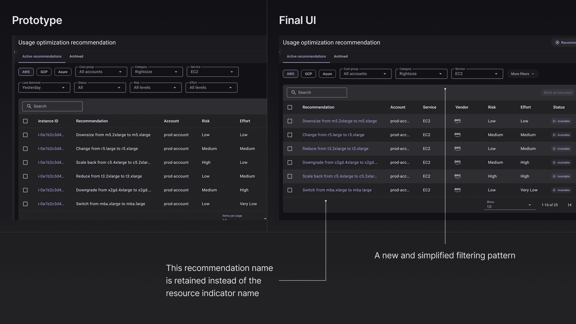 Grouping by resource required significant engineering work—each cloud service names resources differently, requiring custom table configurations for hundreds of service types. I moved this to a future phase so we could launch the core prioritization features faster. Additionally, I streamlined filters to focus on high-value options while maintaining future extensibility.